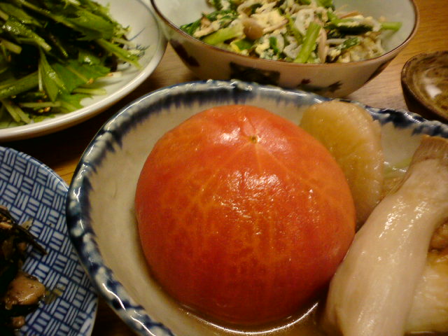 部屋が寒いから、燗酒でアツアツトマト。