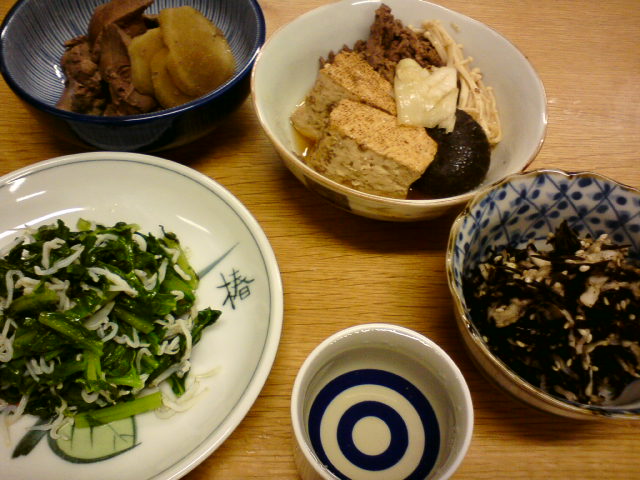 肉じゃが、もつ煮込み、茎わかめ、水菜とトマトのサラダ、