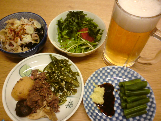 大好物のインゲンのショウガ醤油、そしてビール。