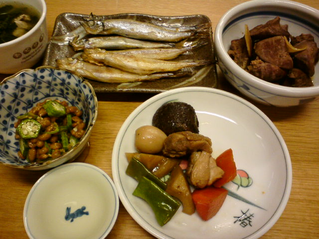 ししゃも、キャペリン、レバーしぐれ煮、筑前煮、オクラ納豆、